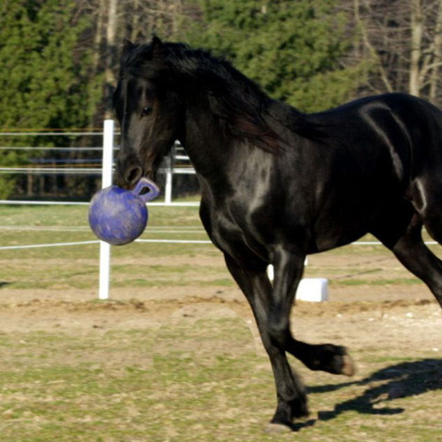 Help alleviate stall boredom with Jolly Ball Horse Toy. Crafted using durable materials, it’s made to last. And unlike other ball toys, this one features an air-free design, maintaining its shape even if punctured from chewing or from playing. This versatile toy’s handle has a large hole for hanging in stalls or throwing in pasture. Help to break your equine friend’s boredom with the Horsemen's Pride Jolly Ball Horse Toy.