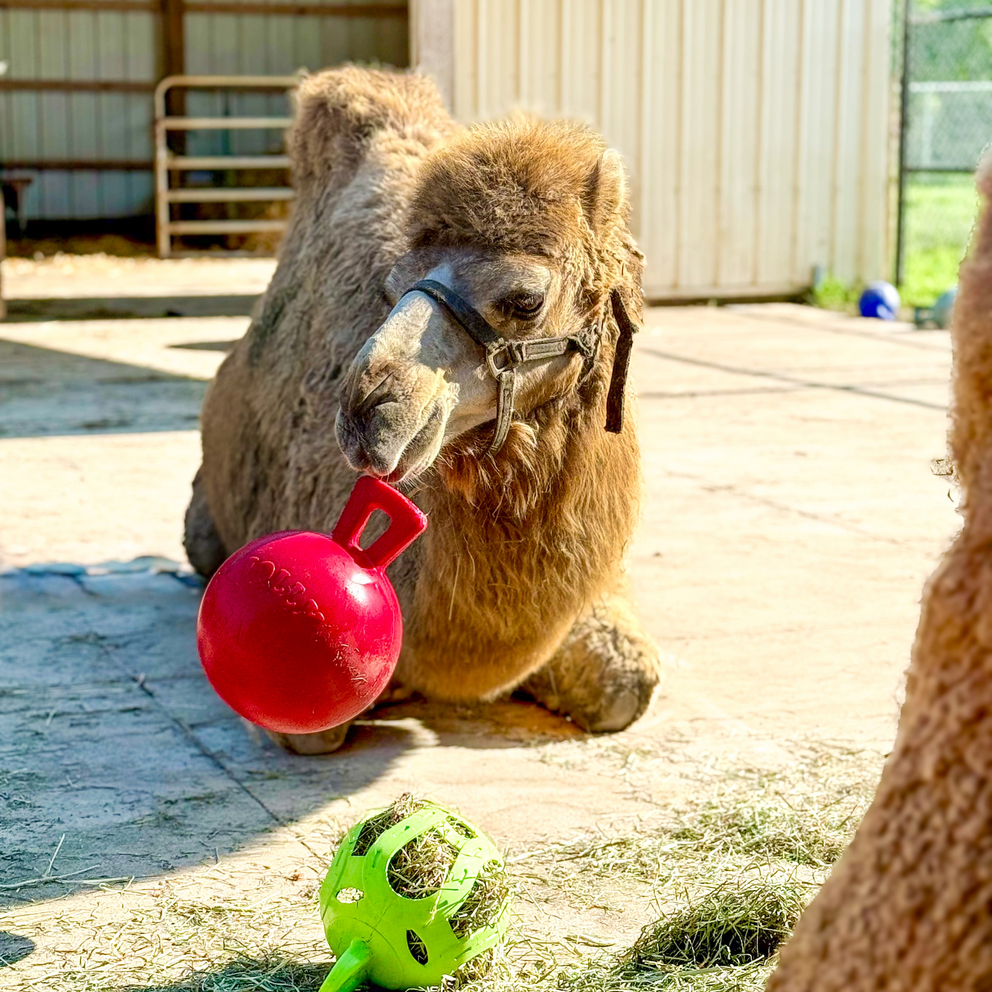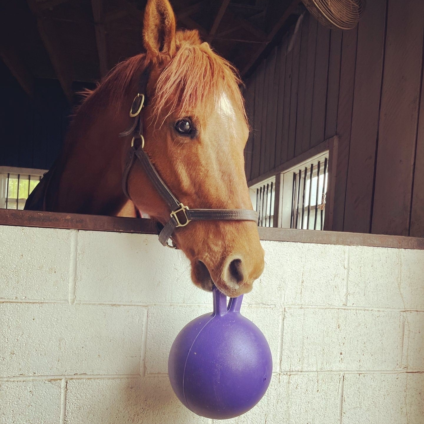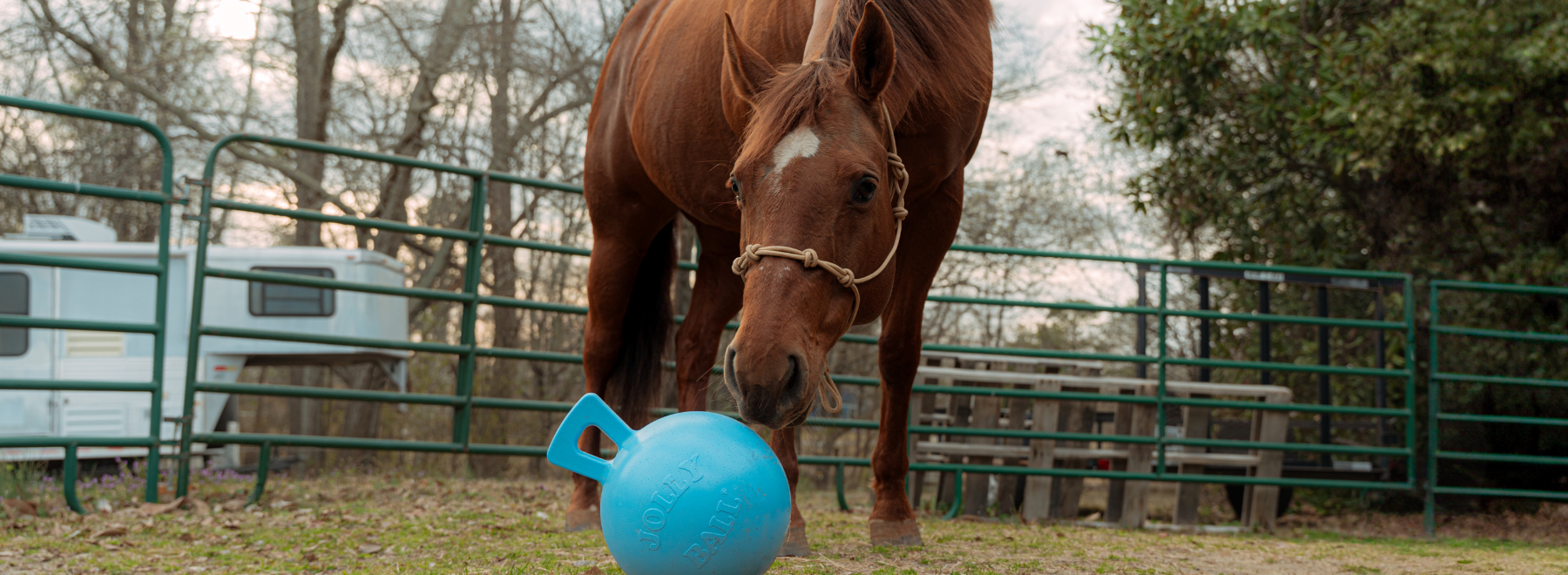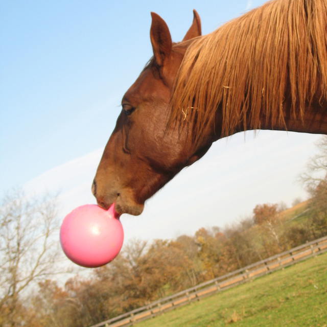 Help alleviate stall boredom with Jolly Ball Horse Toy. Crafted using durable materials, it’s made to last. And unlike other ball toys, this one features an air-free design, maintaining its shape even if punctured from chewing or from playing. This versatile toy’s handle has a large hole for hanging in stalls or throwing in pasture. It’s made in the USA with safe materials and has multiple scents that horses love. Help to break your equine friend’s boredom with Horsemen's Pride Jolly Ball Horse Toy.